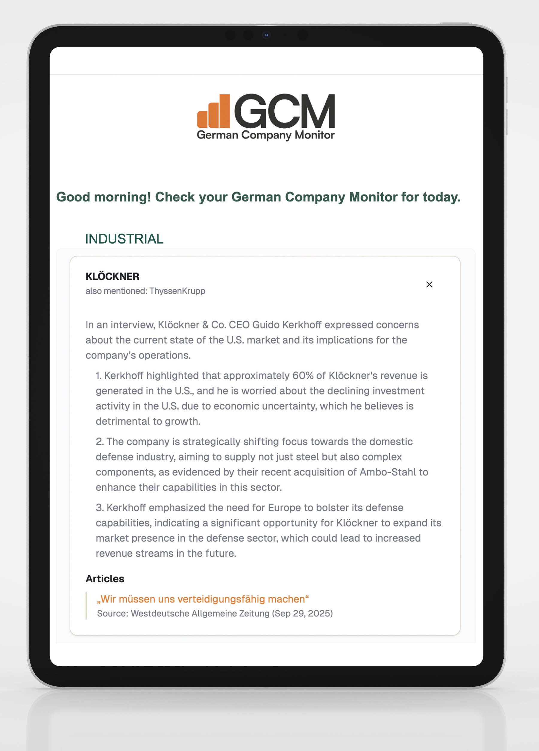 GCM provides a unique, independent view of German company news, including signals that often surface first in regional media.